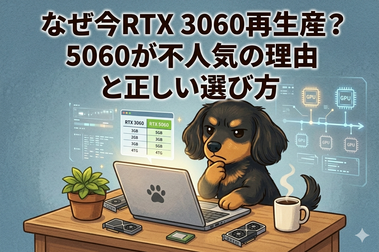 今回は、PCパーツ市場の裏側にある「大人の事情」と「VRAM危機の真実」を5つのステップに分解。さらに、最新の5060や3060のスペックを丸裸にする比較表を用いながら、後悔しない「正しい選び方」を徹底解説します。